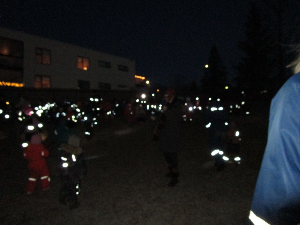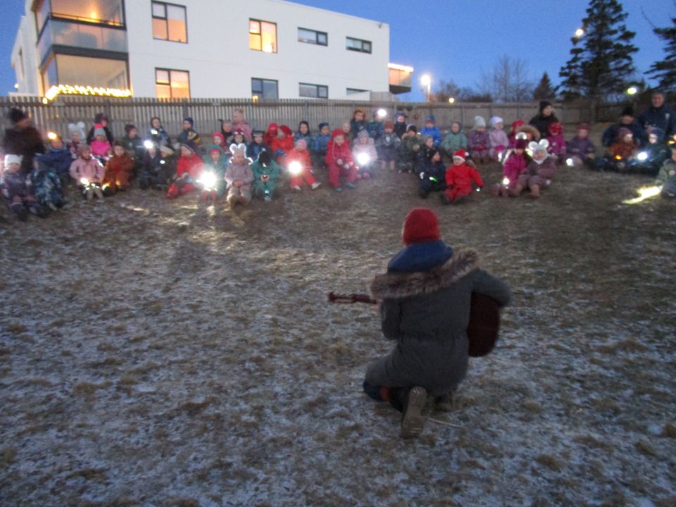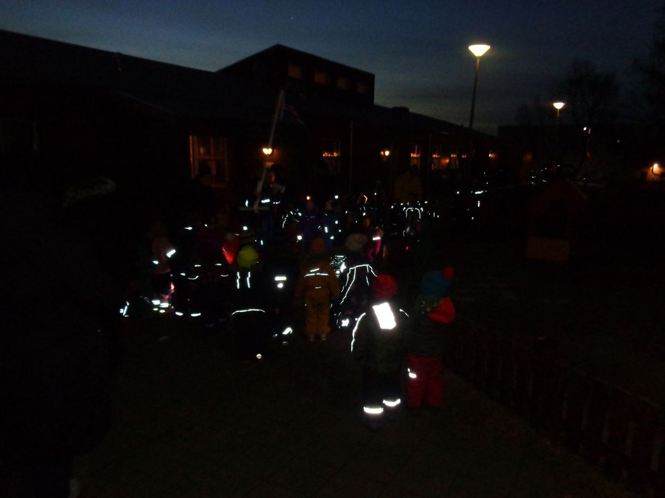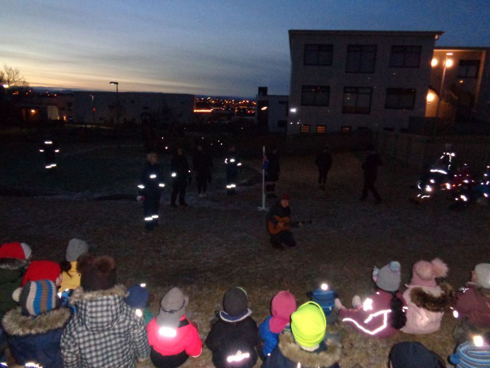 Við gerðum okkur dagamun í dag þar sem allir mættu í náttfötum og með vasaljós. Búið var að hengja endurskinsmerki í trén í garðinum merkt hverju barni. Um leið og börnin komu fóru þau í að leita að endurskinsmerki sem var merkt þeim og var það partur af læsi að þekkja nafnið sitt en þau yngir voru merkt með mynd. Um klukkan níu var farið í skrúðgöngu um garðinn og safnast saman í brekkunni. Þar sungu við öll saman og börnin komu undirritaðri á óvart með Urðarhólslagi við Waka waka. Ég verð að segja að ég fékk tár í augun að sjá ljómann í augum barnanna. Eftir sönginn héldum við inn í leik og fengum pitsu og ís í hádegismat og var svo að sjálfsögðu afmæliskaka í kaffinu. Þetta var skemmtilegur dagur og ekki að sjá annað en börnin nutu sín í botn.